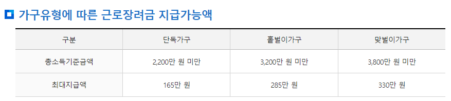 2024 근로장려금 신청자격 신청방법 포스팅에서 가장 중요한 내용입니다. 바로, 소득 기준입니다. 아래와 같은 소득 금액에 포함되어야만 신청이 가능합니다.