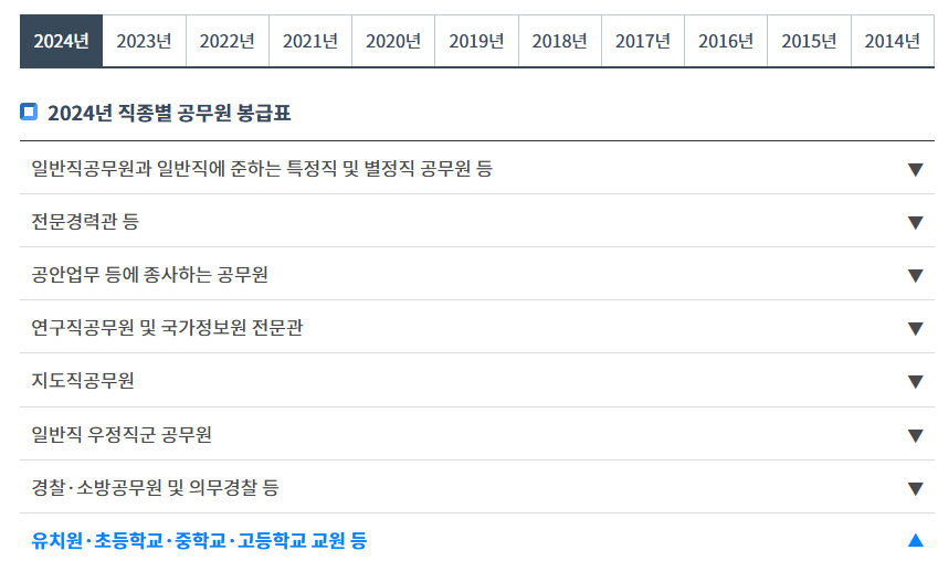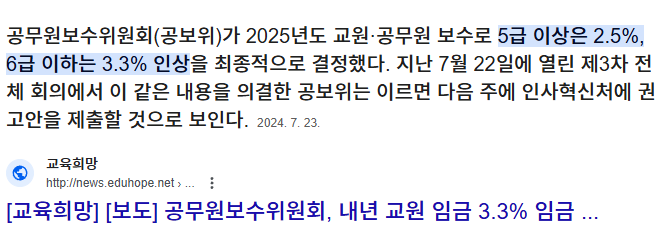 2025년 교원 봉급표 교사 호봉표 월급인상률 개요를 살펴보겠습니다. 앞서 말씀드린 대로 기획재정부에서 국가공무원 보수 인상률을 전년대비 0.5 포인트 올린 3%를 적용할 것이라고 결정하였는데요. 인사혁신처 홈페이지에서는 매년 교원 봉급표와 호봉표를 공식적으로 발표하고 있으나 글 작성일 기준 아직 2025년 정보는 올라오지 않았습니다. 현재 적용된 월급에 3% 인상률을 적용한 예상 봉급표가 아마 가장 비슷할 것으로 보입니다. 혹시나 올라올 수 있으니 아래에서 더욱 자세한 내용을 확인해보시기 바랍니다.