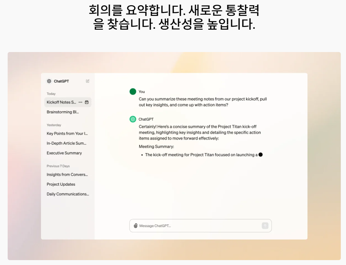어플을 설치 하신 이후에는 계정을 생성하고 로그인해야 합니다. 앱을 실행하면 로그인 화면이 나타납니다. 이미 OpenAI 계정이 있다면 해당 정보로 로그인하면 되고, 없다면 '회원가입' 옵션을 선택하여 새 계정을 만들 수 있습니다. 계정 생성 시 이메일 주소와 비밀번호를 입력해야 하며, 이메일 인증 과정을 거쳐야 할 수도 있습니다. 로그인이 완료되면 ChatGPT의 모든 기능을 사용할 수 있게 됩니다! 특히 구글, 마이크로소프트, 애플 아이디로 손쉽게 로그인이 가능해서 가입 과정이 간소화되서 좋아요.