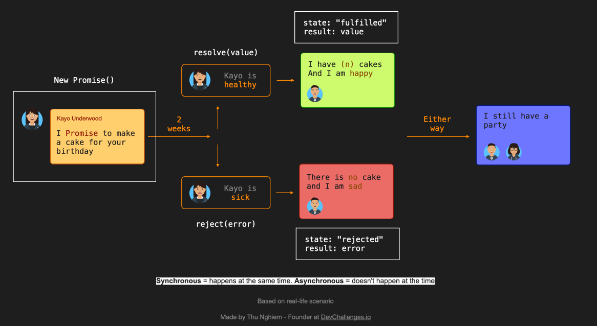 Promise는 비동기 작업의 최종 완료(또는 실패) 및 그 결과값을 나타냅니다. Promise 객체는 다음 세 가지 상태 중 하나를 가질 수 있습니다: