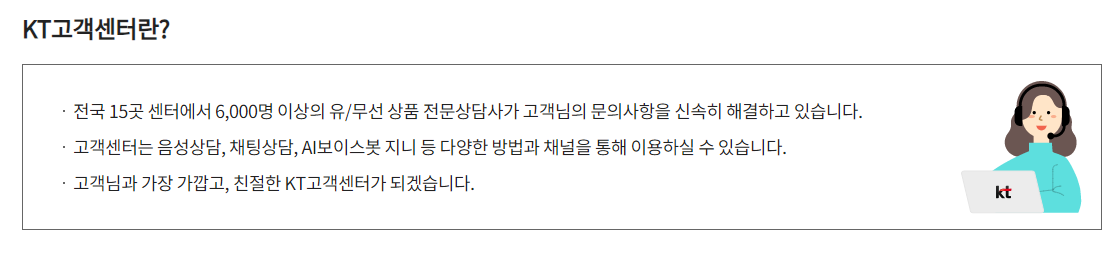 어떤 카테고리에 대해 문의를 하고싶냐에 따라 달라집니다. kt는 여러가지 분야에서 사업을 하고 있기 때문입니다. 제가 첨부해드린 이미지를 확인해서 전화번호를 확인하시거나, 대표적으로 이용하는 아래의 번호를 확인해보세요.