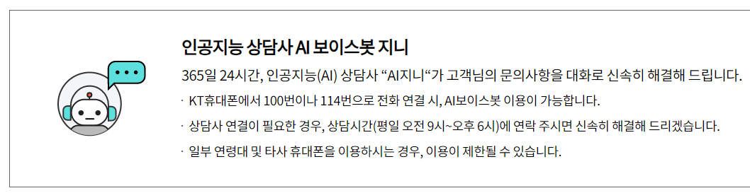 - AI 보이스봇 지니 : AI 통화비서인 AI 지니를 통해 고객 문의를 24시간 받을 수 있는 서비스를 이용하실 수 있습니다.
