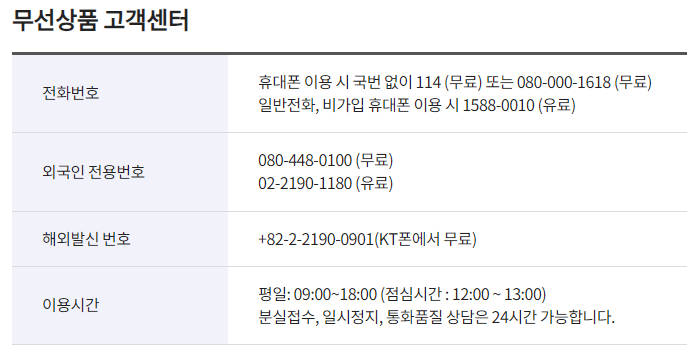 - 휴대폰 이용 시 : 지역번호 +100 (KT 폰에서는 무료) 또는 080-000-9999(무료)