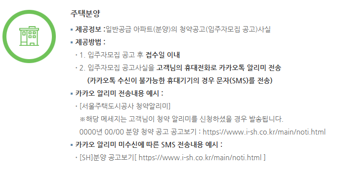 sh공사 홈페이지 (www.i-sh.co.kr) 접속 후 가장 많이 찾으시는 정보 중 하나가 바로 청약 정보일 것입니다. '청약정보' 메뉴에서는 현재 모집 중인 주택의 공고문을 확인할 수 있고, 청약 자격과 일정 등 상세한 정보를 얻을 수 있죠. 특히 인터넷 청약 시스템을 통해 온라인으로 편리하게 청약 신청을 할 수 있어 많은 분들이 이용하고 있습니다. 또한 주택분양 알리미 등, 청약 공고가 뜨는 순간 알림을 제공해주는 알리미 서비스를 이용하실 수도 있습니다. 아래에서 바로 이용해보시기 바랍니다.