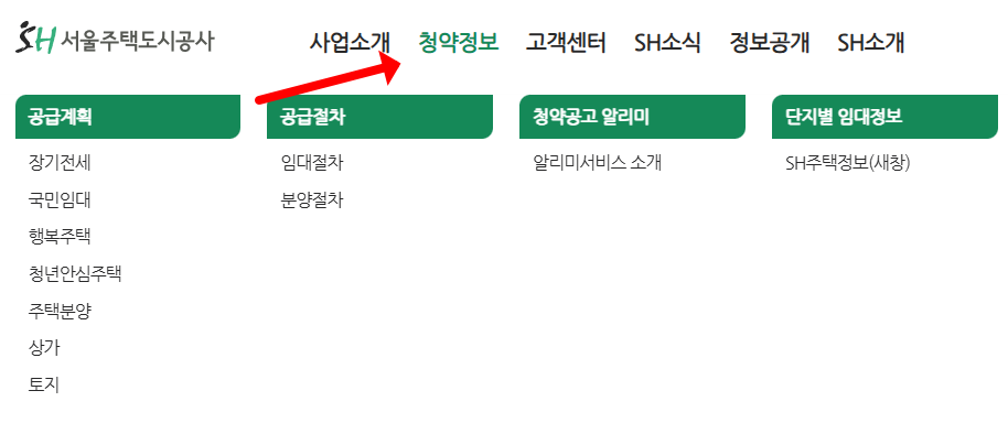 sh공사 홈페이지 (www.i-sh.co.kr) 접속 후 가장 많이 찾으시는 정보 중 하나가 바로 청약 정보일 것입니다. '청약정보' 메뉴에서는 현재 모집 중인 주택의 공고문을 확인할 수 있고, 청약 자격과 일정 등 상세한 정보를 얻을 수 있죠. 특히 인터넷 청약 시스템을 통해 온라인으로 편리하게 청약 신청을 할 수 있어 많은 분들이 이용하고 있습니다. 또한 주택분양 알리미 등, 청약 공고가 뜨는 순간 알림을 제공해주는 알리미 서비스를 이용하실 수도 있습니다. 아래에서 바로 이용해보시기 바랍니다.