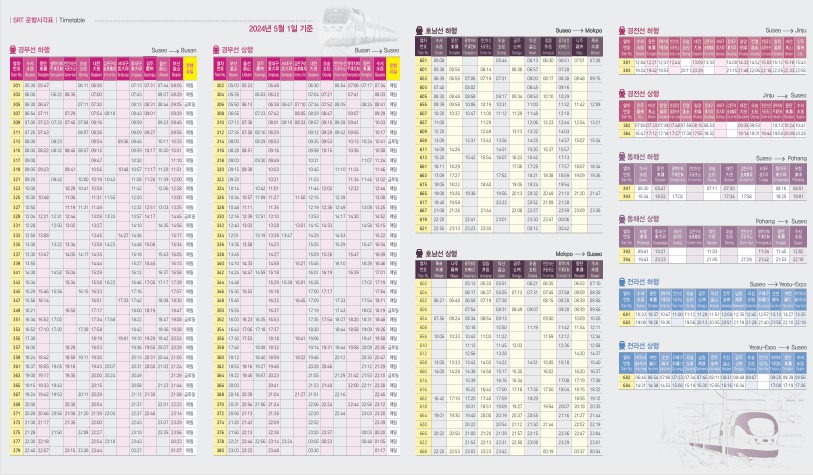 먼저, SRT 공식 홈페이지 및 모바일 앱을 통해 시간표를 확인하실 수 있습니다. 홈페이지에 접속한 후 '열차 시간표' 섹션 아래의 시간표 자료를 다운로드 하시면 되는데요. 가장 최근의 자료는 2024년 5월 1일 기준입니다. 또한 어플을 이용하면 출발역, 도착역, 날짜를 입력하여 원하는 시간대의 열차 정보를 확인할 수 있습니다. 모바일 앱을 이용하면 언제 어디서나 간편하게 예매할 수 있어 더욱 편리한 것 같습니다. 전체적인 시간표를 한눈에 확인하고 싶다면 아래의 링크를 확인해주세요.